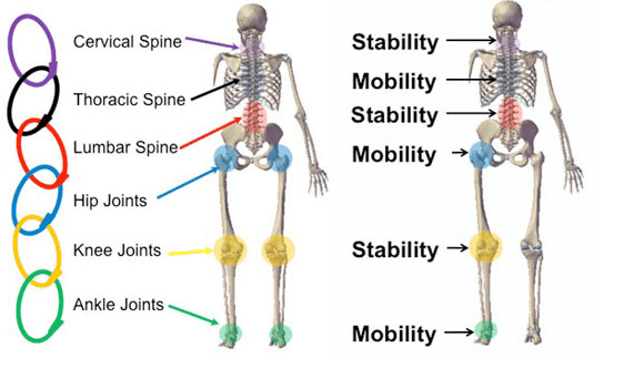 En este caso todo gira alrededor de las articulaciones dónde en unas predomina la ESTABILIDAD y en otras la MOVILIDAD, de este modo, el cuerpo trabaja globalmente de manera correcta para el cual ha sido creado evitando compensaciones patológicas.